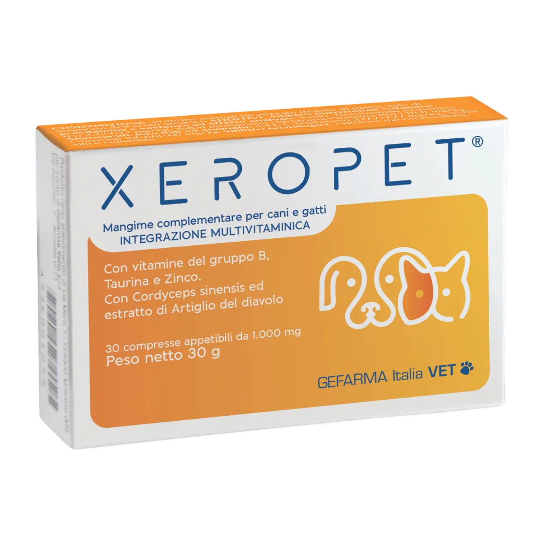 Xeropet è un mangime complementare in compresse appetibili per cani e gatti, indicato per supportare animali con maggiori esigenze nutrizionali ed energetiche.